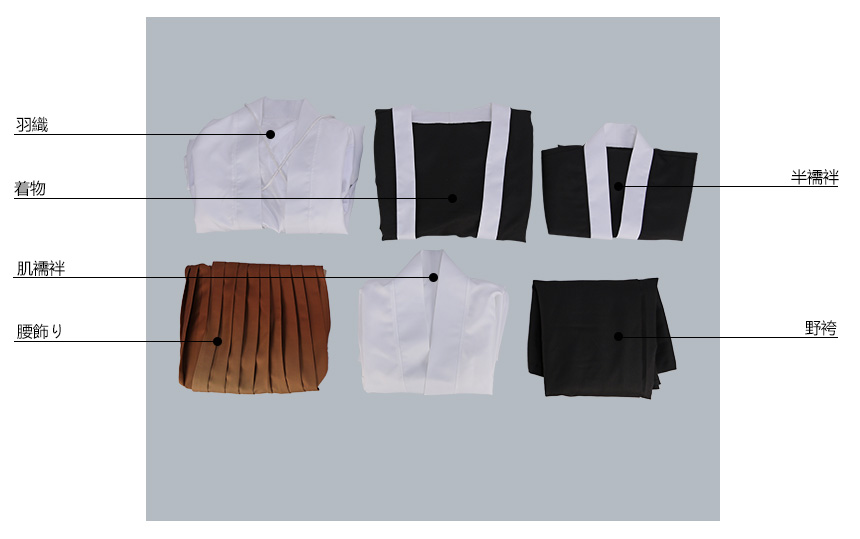 羽織、着物、半襦袢、肌襦袢、腰飾り、野袴、パンツ、飾り物(首飾り、肩掛け、肩ベルト、帯、腰紐、ベルト、アームカバー2点)