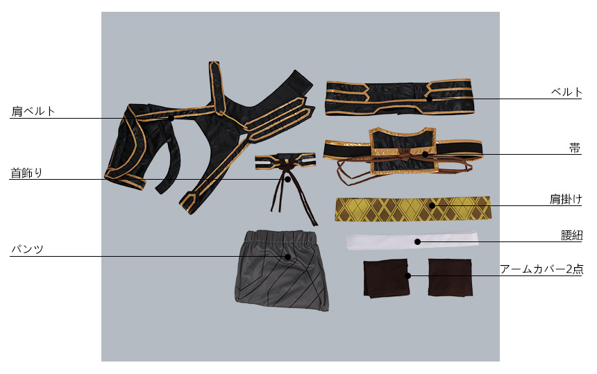 首飾り、肩掛け、肩ベルト、帯、腰紐、ベルト、アームカバー2点も付属しています。