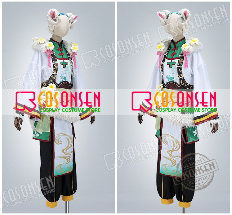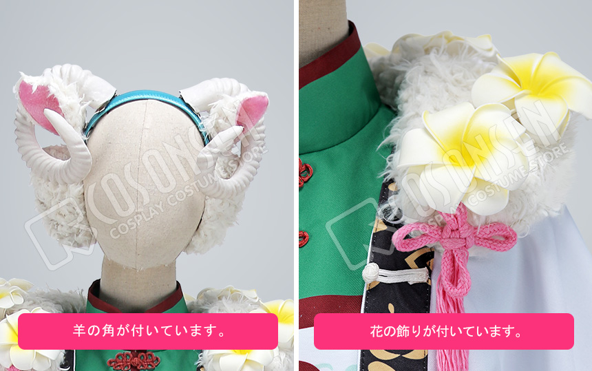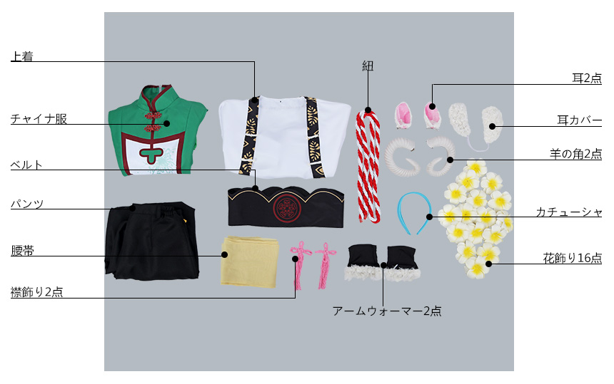 上着、チャイナ服、パンツ、飾り物(カチューシャ、羊の角2点、ファー襟、襟飾り2点、花飾り10点、アームウォーマー2点、紐、ベスト、腰帯、腰飾り)