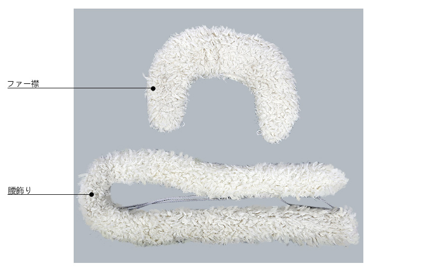 カチューシャ、羊の角2点、ファー襟、襟飾り2点、花飾り10点、アームウォーマー2点、紐、ベスト、腰帯、腰飾りも付属しています。