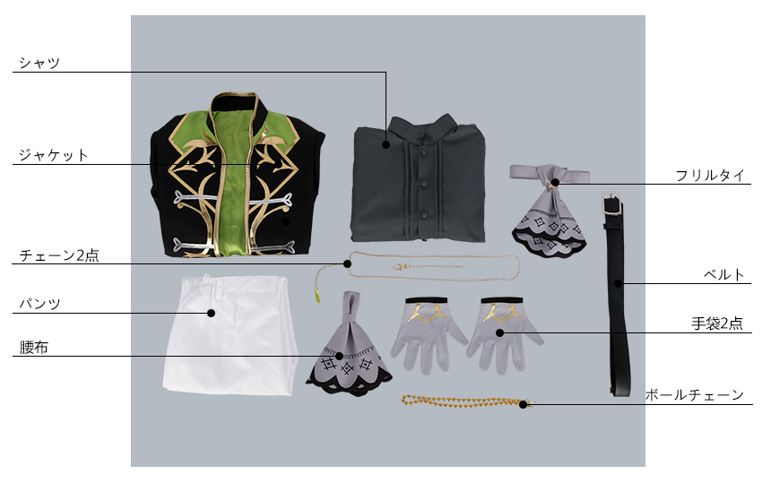 ジャケット、シャツ、パンツ、飾り物(フリルタイ、ベルト、チェーン2点、ボールチェーン、腰布、腰飾り、手袋2点)