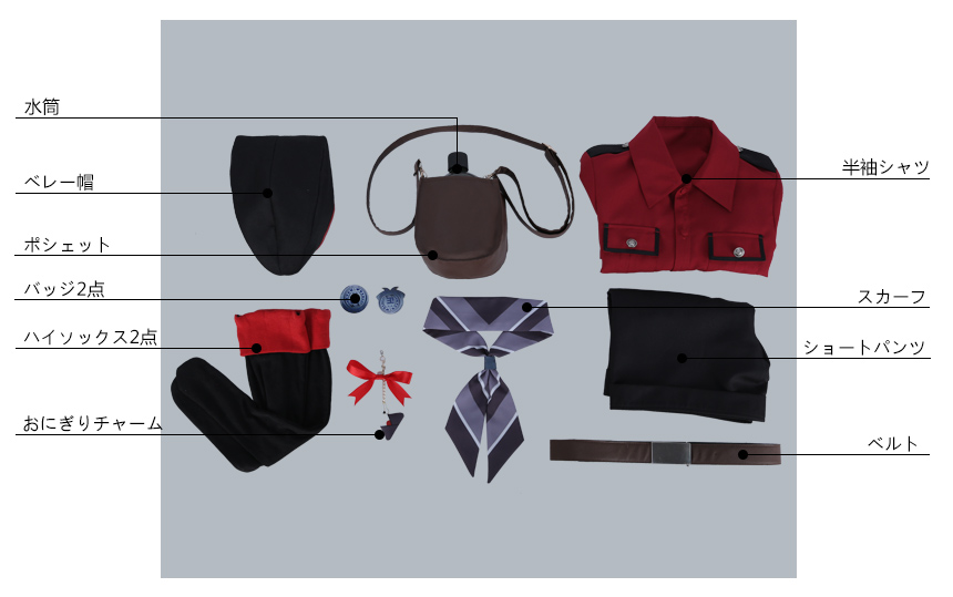 半袖シャツ、ショートパンツ、飾り物(ベレー帽、スカーフ、水筒、ポシェット、バッジ2点、ハイソックス2点、おにぎりチャーム、ベルト)
