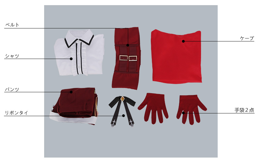 ケープ、シャツ、パンツ、飾り物(リボンタイ、宝石、ベルト、手袋2点)