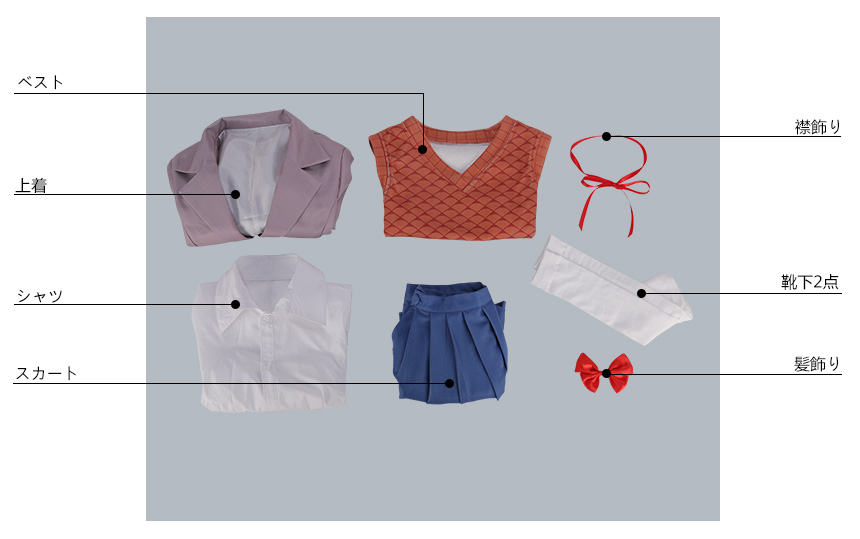 上着、ベスト、シャツ、スカート、飾り物(髪飾り、襟飾り、靴下2点)