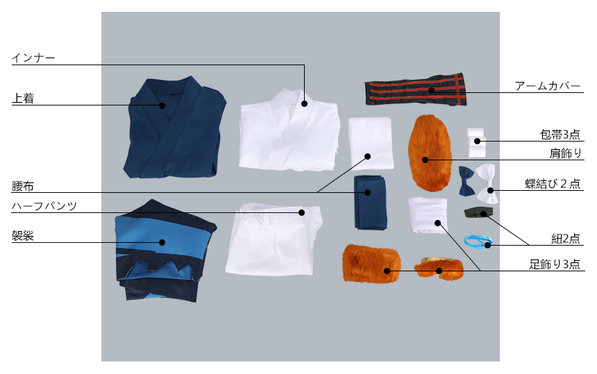 袈裟、上着、インナー、ハーフパンツ、飾り物(笠、肩飾り、蝶結び2点、腰布2点、アームカバー、紐2点、包帯3点、足飾り3点、尻尾)