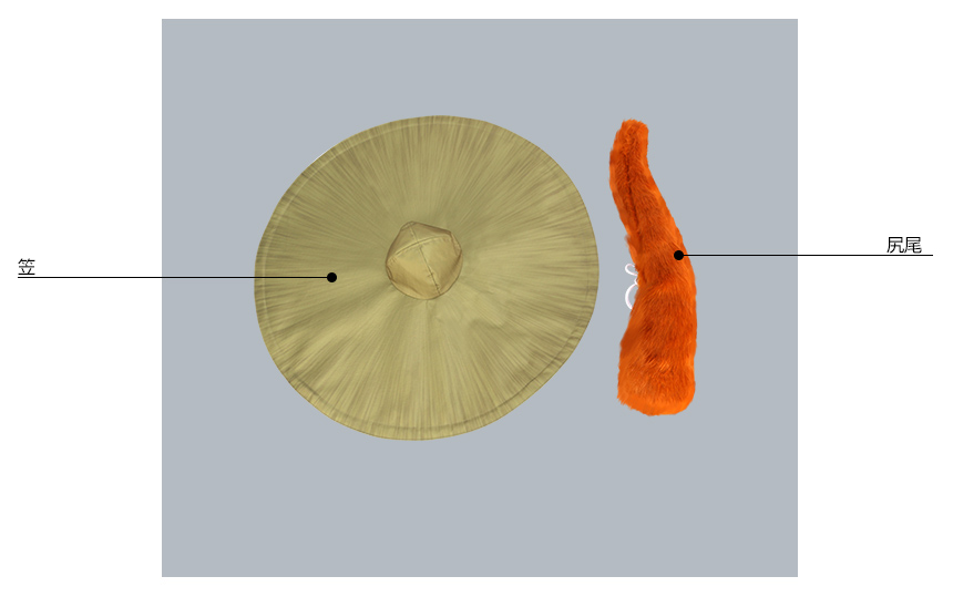笠、肩飾り、蝶結び2点、腰布2点、アームカバー、紐2点、包帯3点、足飾り3点、尻尾も付属しています。