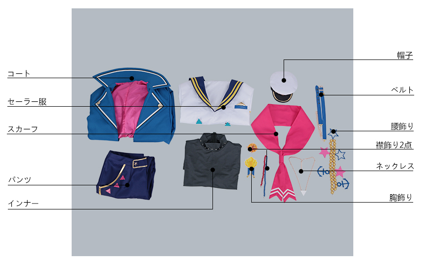コート、セーラー服、インナー、パンツ、飾り物(帽子、ネックレス、襟飾り2点、胸飾り、ベルト、腰飾り、スカーフ)