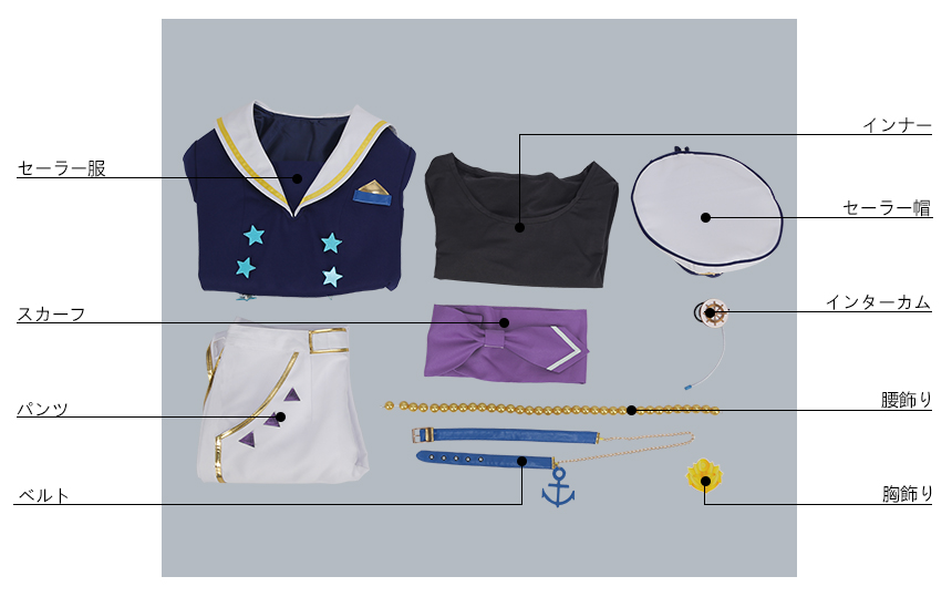 セーラー服、インナー、パンツ、飾り物(スカーフ、セーラー帽、胸飾り、腰飾り、ベルト)