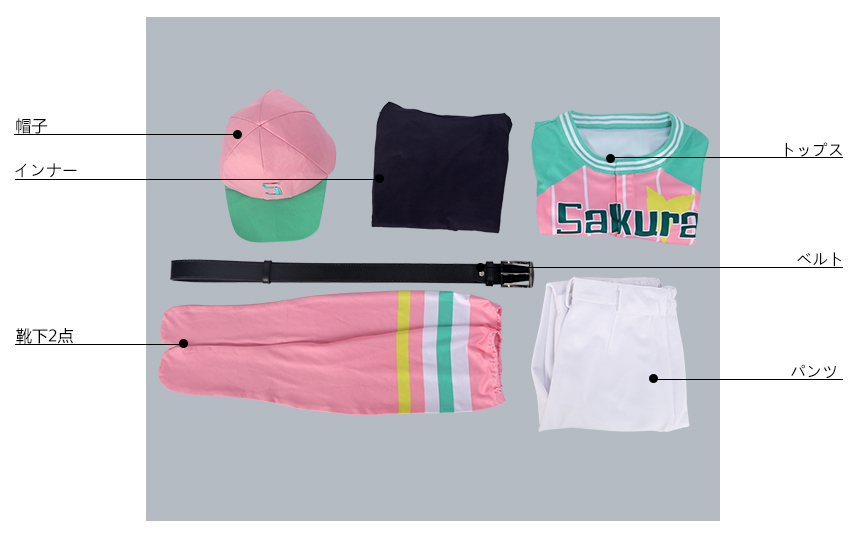 トップス、インナー、パンツ、飾り物(帽子、ベルト、靴下2点)