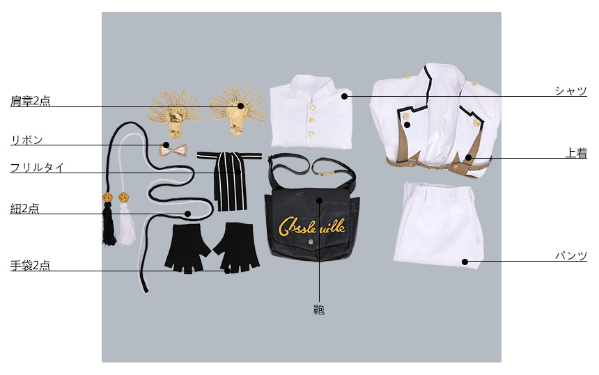 上着、シャツ、パンツ、飾り物(肩章2点、リボン、フリルタイ、紐2点、手袋2点、鞄)