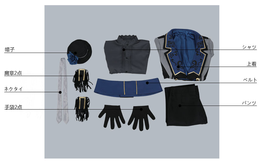 上着、シャツ、パンツ、飾り物(帽子、ネクタイ、肩章2点、数珠2点、ベルト、手袋2点)