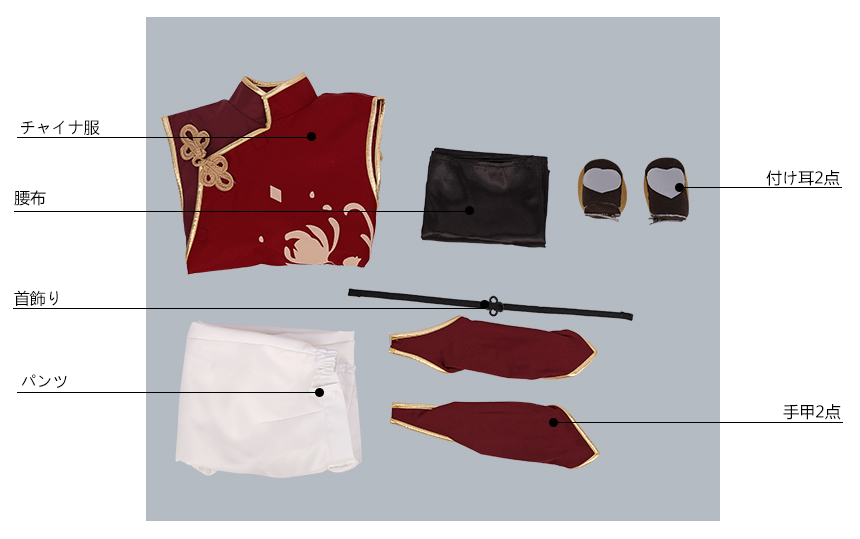 チャイナ服、パンツ、飾り物(カチューシャ、首飾り、手甲2点、腰布)