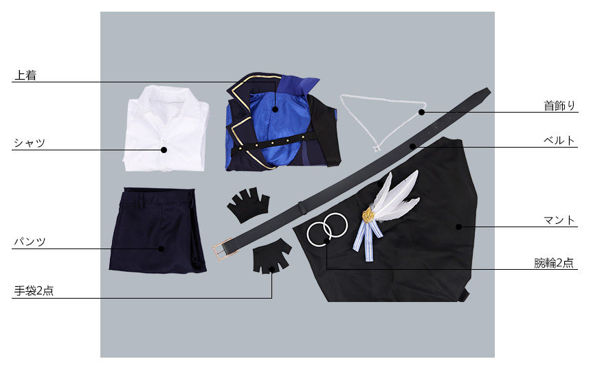 マント、上着、シャツ、パンツ、飾り物(首飾り、手袋2点、ベルト、腕輪2点)