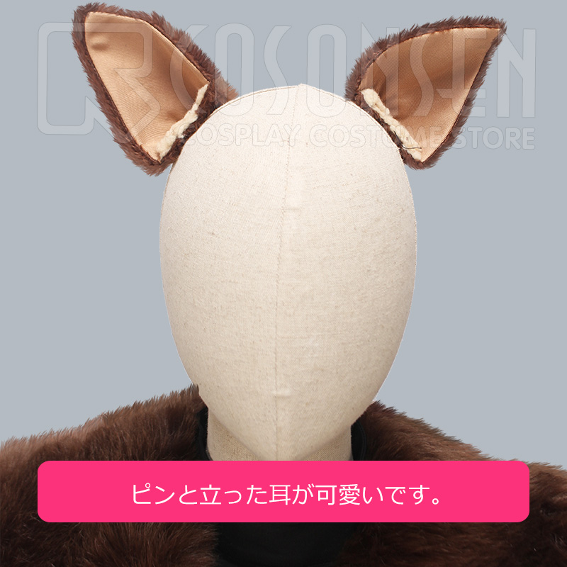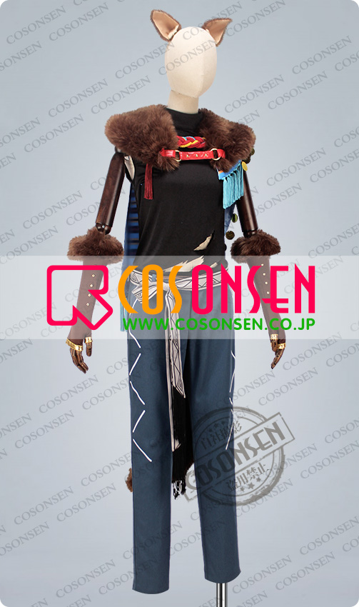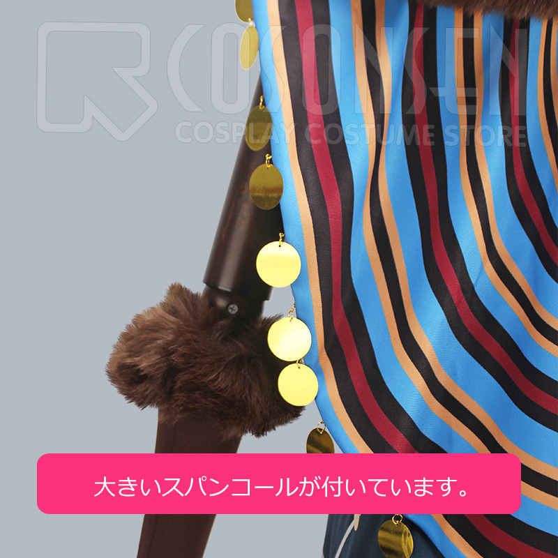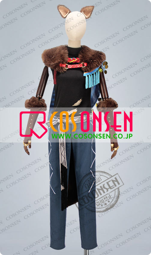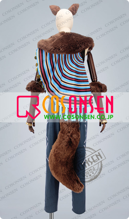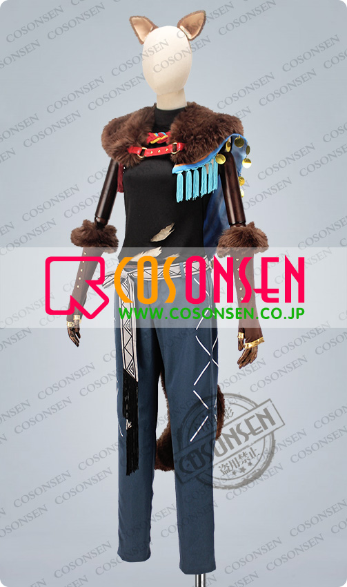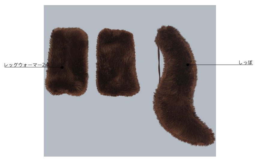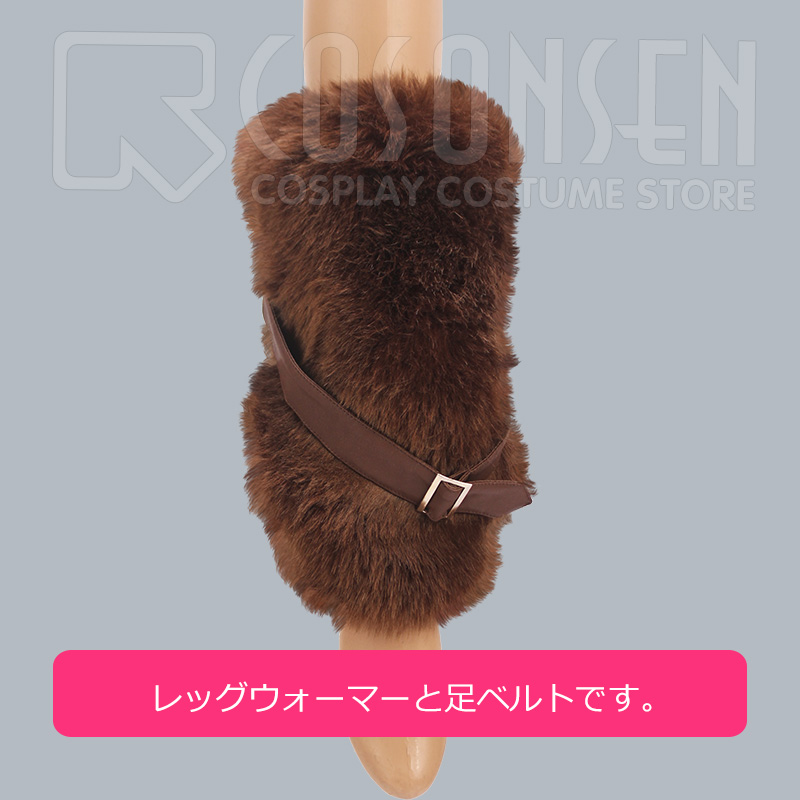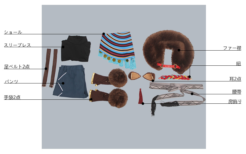 ショール、ファー襟、耳2点、しっぽ、手袋2点、紐、腰帯、房飾り、レッグウォーマー2点、足ベルト2点も付属しています。