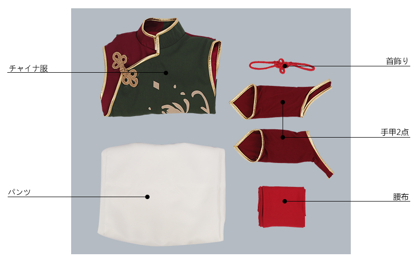 チャイナ服、パンツ、飾り物(首飾り、腰布、手甲2点)