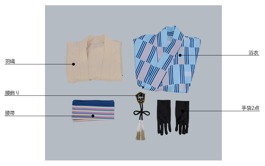 羽織、浴衣、飾り物(腰帯、腰飾り、手袋2点)