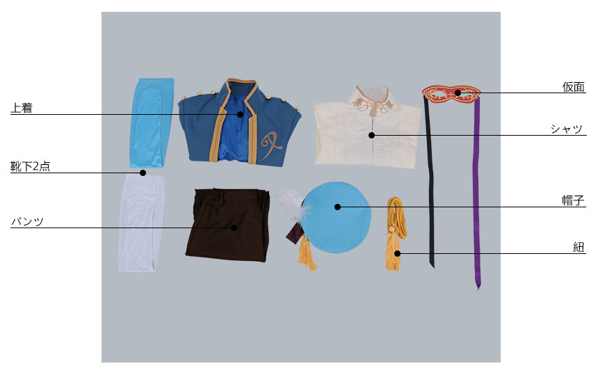 上着、シャツ、パンツ、飾り物(帽子、仮面、紐、靴下2点)
