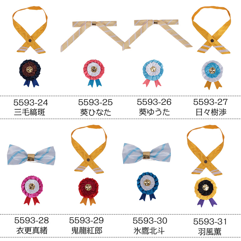 一般的に青地×白縞の蝶ネクタイと布で作ったロゼットを発送いたします。