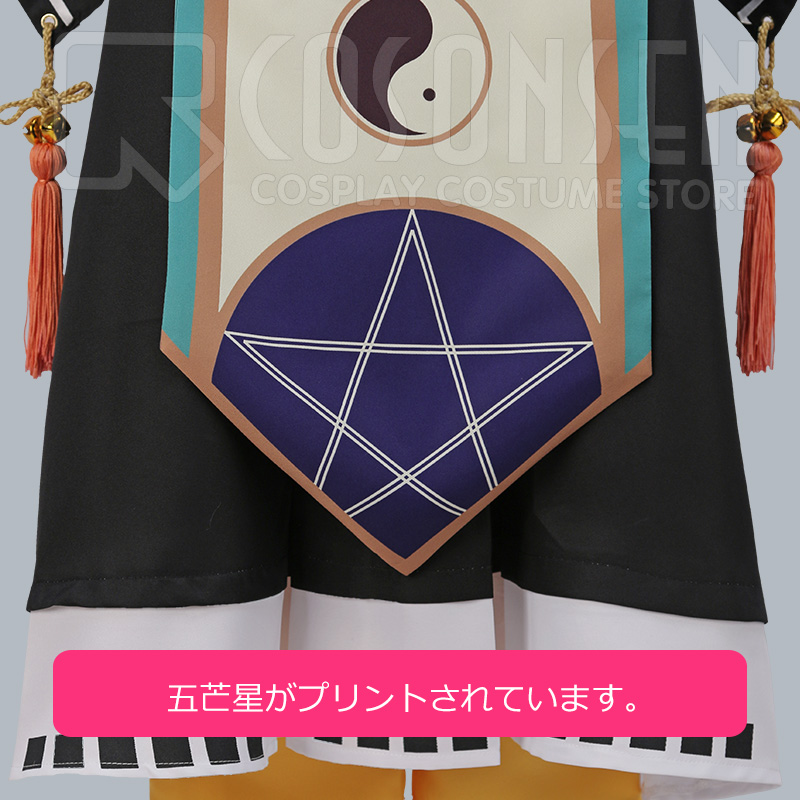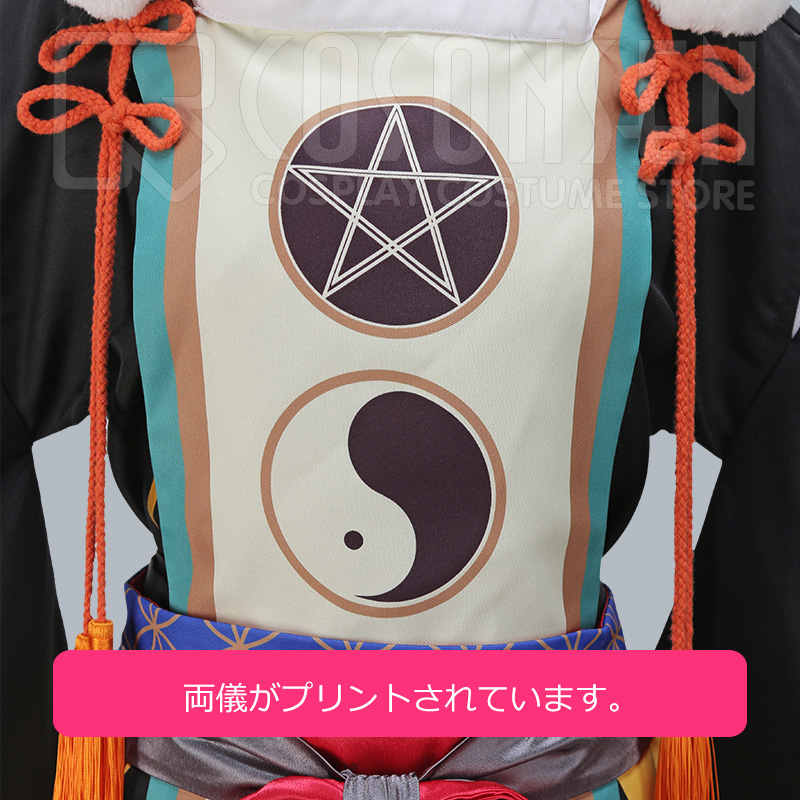 ポリエステルツイルで製作しました。胸元と裾に五芒星と両儀の絵がプリントしました。後ろに五芒星と両儀の絵もプリントされています。忠実に再現するよう心掛けています。