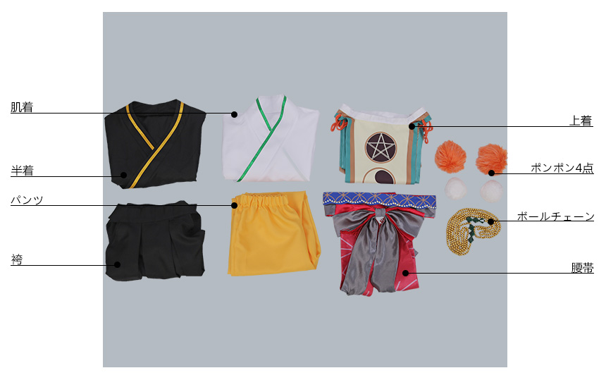 上着、半着、肌着、袴、パンツ、飾り物(ポンポン4点、腰帯、ボールチェーン)