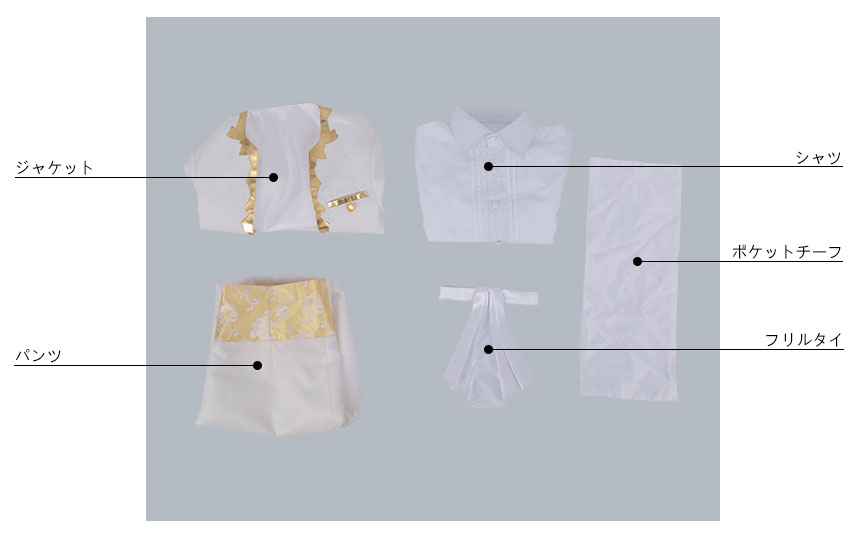 ジャケット、シャツ、パンツ、飾り物(フリルタイ、ポケットチーフ)