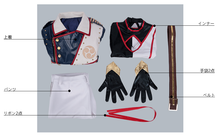 上着、インナー、パンツ、飾り物(手袋2点、リボン2点、ベルト)