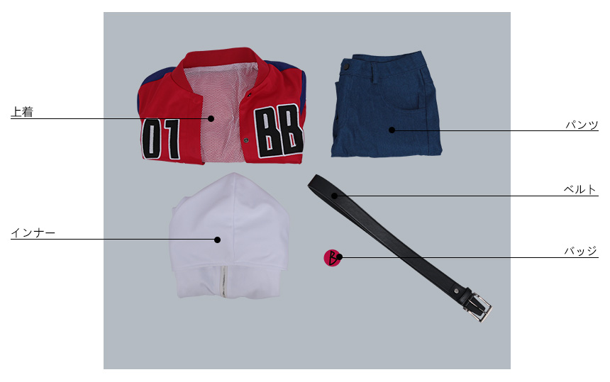 上着、インナー、パンツ、飾り物(バッジ、ベルト)
