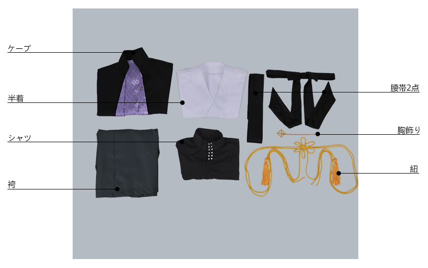 ケープ、半着、シャツ、袴、飾り物(腰帯2点、胸飾り、紐)