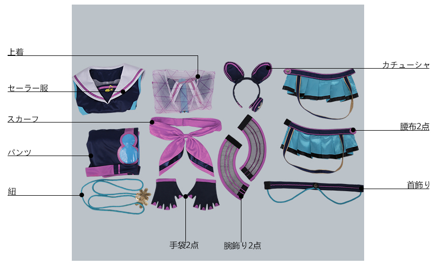 上着、セーラー服、パンツ、飾り物(カチューシャ、首飾り、スカーフ、紐、手袋2点、腕飾り2点、腰布2点)