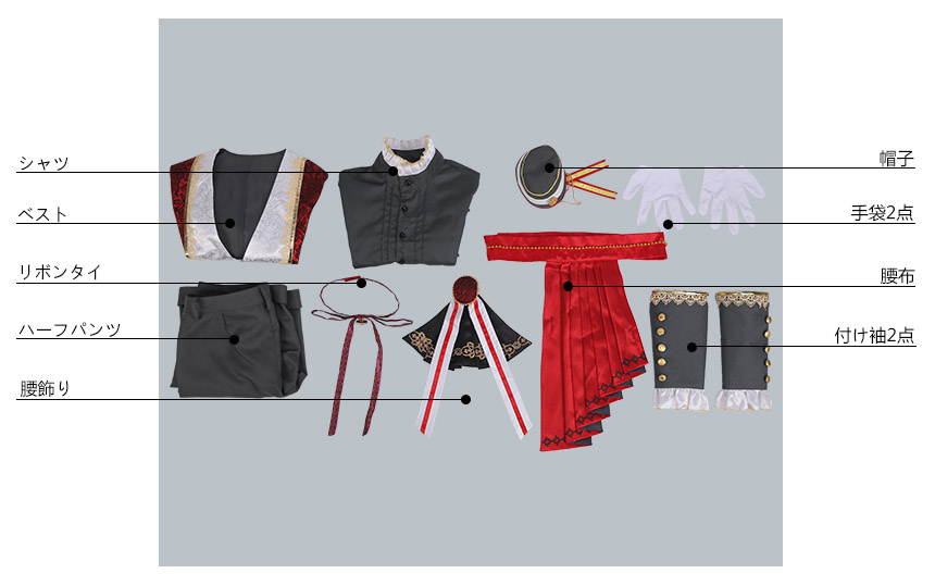 ベスト、シャツ、ハーフパンツ、飾り物(帽子、リボンタイ、手袋2点、腰布、付け袖2点、腰飾り)