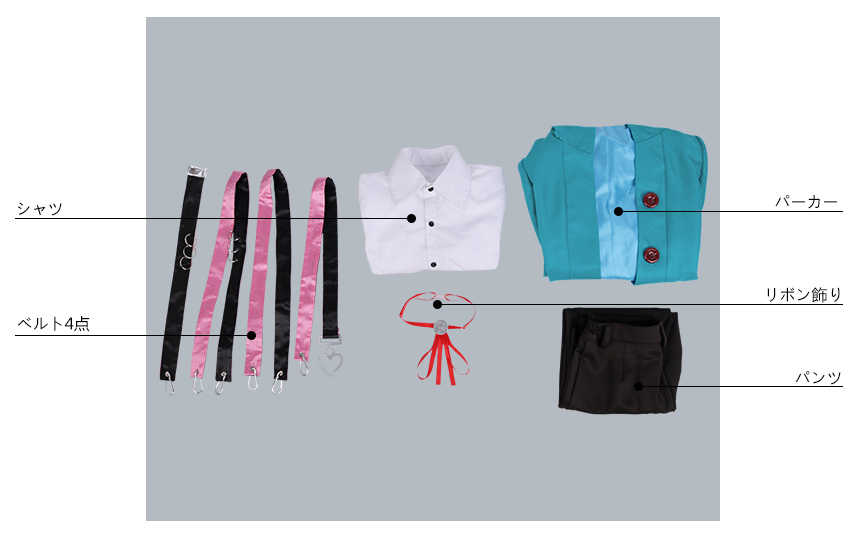 パーカー、シャツ、パンツ、飾り物(リボン飾り、ベルト4点)