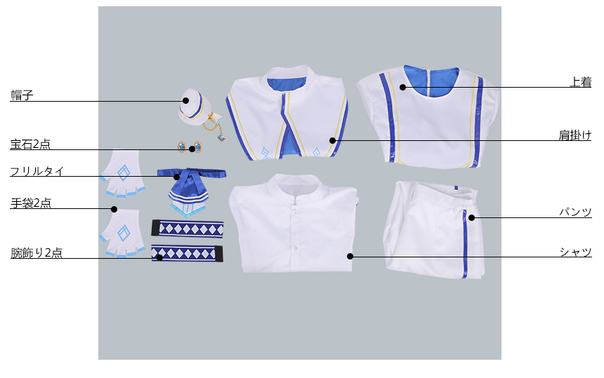 肩掛け、上着、シャツ、パンツ、飾り物(帽子、フリルタイ、宝石2点、手袋2点、腕飾り2点)
