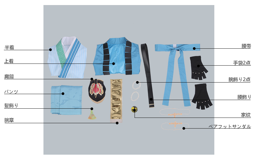 上着、半着、パンツ、飾り物(髪飾り、肩鎧、腕章、手袋2点、腕飾り2点、腰帯、腰飾り、家紋、ベアフットサンダル
