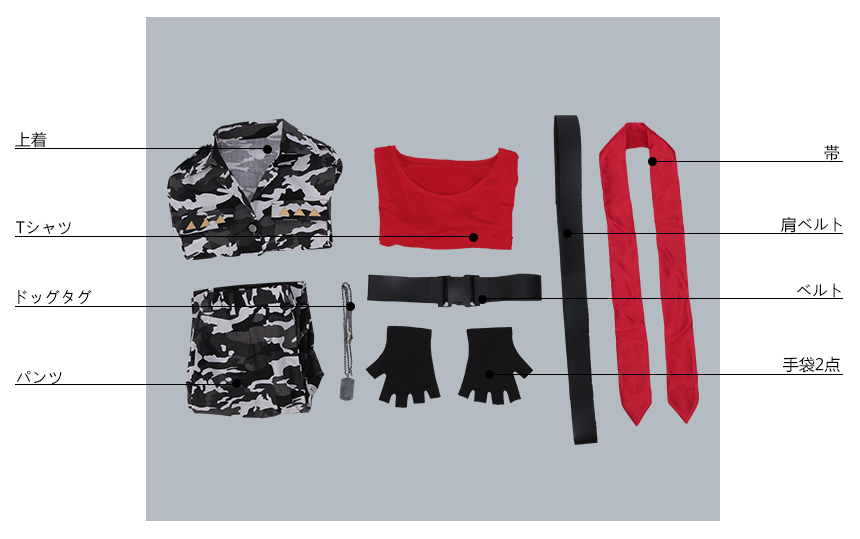 上着、Tシャツ、パンツ、飾り物(ドッグタグ、肩ベルト、ベルト、手袋2点、帯)