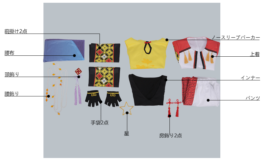 上着、ノースリーブパーカー、インナー、パンツ、飾り物(縁飾り2点、前掛け2点、腰布、腰飾り2点、手袋2点)