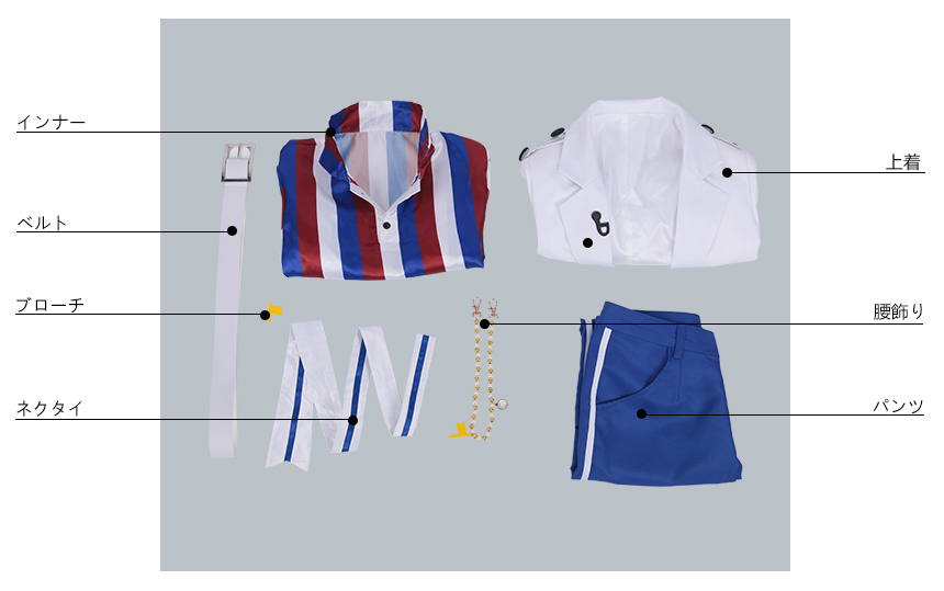 上着、インナー、パンツ、飾り物(ブローチ、ネクタイ、腰飾り、ベルト)