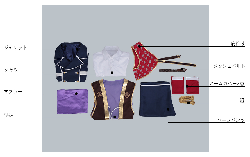 法被、ジャケット、シャツ、ハーフパンツ、飾り物(マフラー、肩飾り、メッシュベルト、紐、アームカバー2点)
