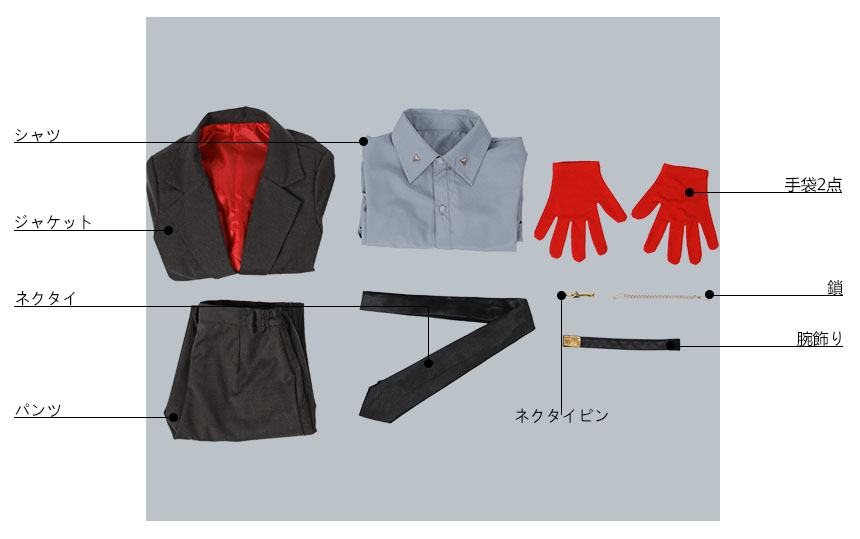 ジャケット、シャツ、パンツ、飾り物(ネクタイ、飾り2点、手袋2点、腕飾り)