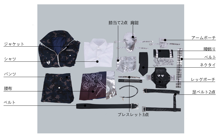 ジャケット、シャツ、パンツ、飾り物(腰布、ベルト、肩鎧、アームポーチ、ネクタイ、腰飾り、レッグポーチ、膝当て2点、足ベルト2点、ブレスレット3点)