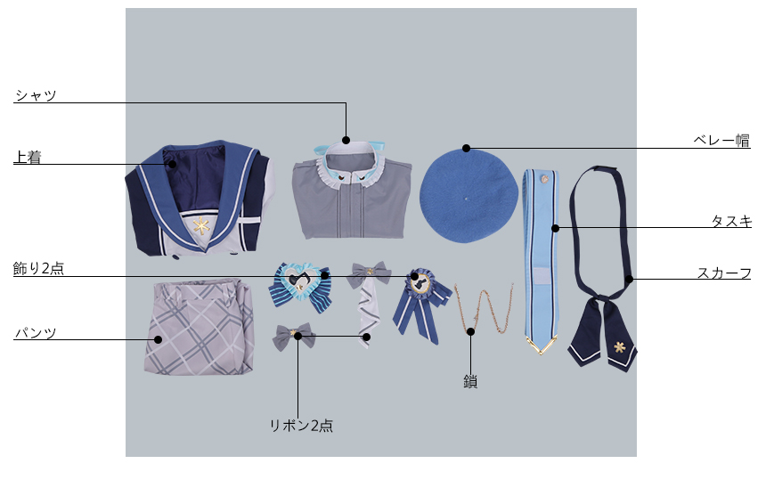 上着、シャツ、パンツ、飾り物(ベレー帽、スカーフ、タスキ、飾り2点、リボン2点、鎖)