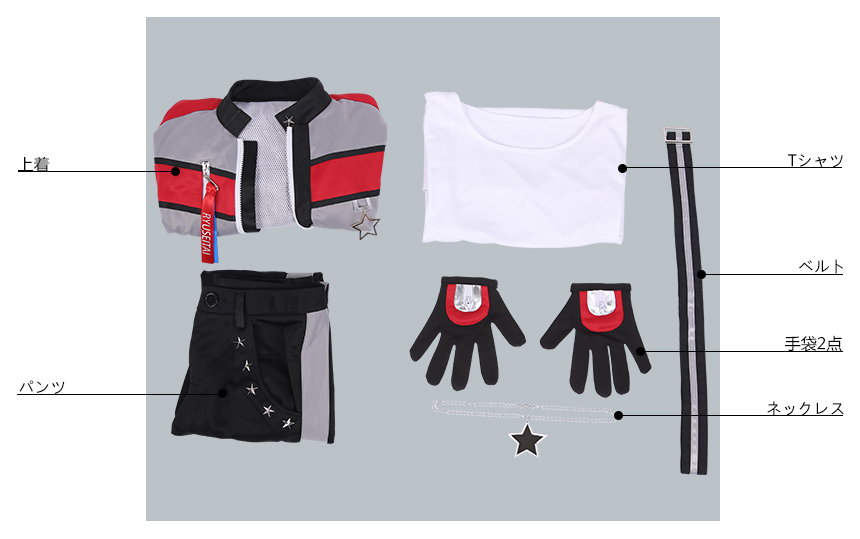 上着、Tシャツ、パンツ(ネックレス、ベルト、手袋2点)