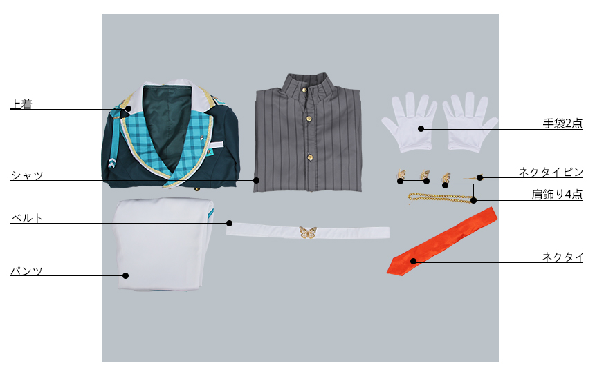 上着、シャツ、パンツ、飾り物(ネクタイ、ネクタイピン、ベルト、肩飾り4点、手袋2点)