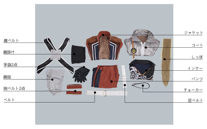 コート、ジャケット、インナー、パンツ、飾り物(チョーカー、しっぽ、肩掛け、肩ベルト、肩鎧、手袋2点、腕ベルト2点、足ベルト、ベルト)