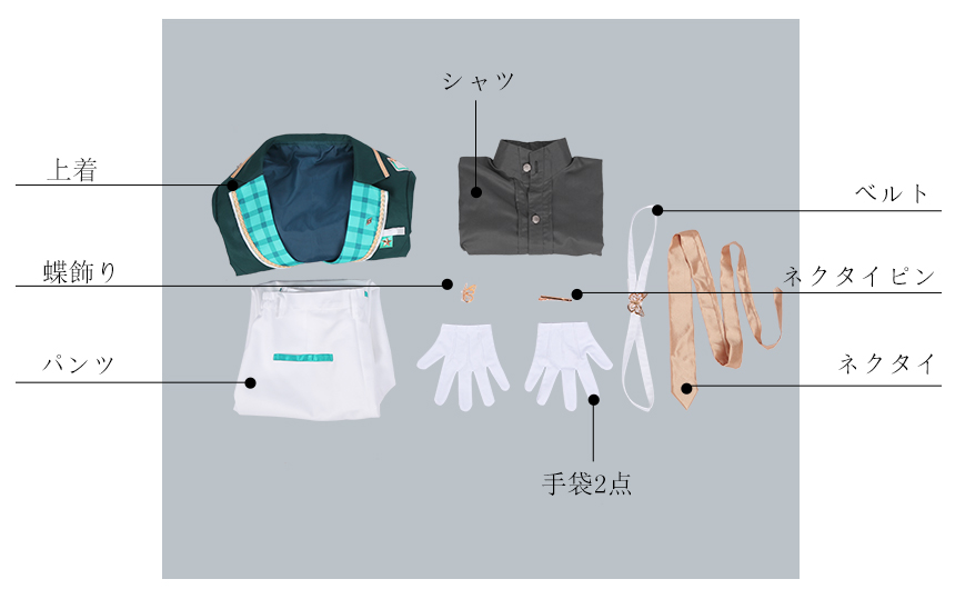 上着、シャツ、パンツ、飾り物(ネクタイ、ネクタイピン、ベルト、蝶飾り、手袋2点)