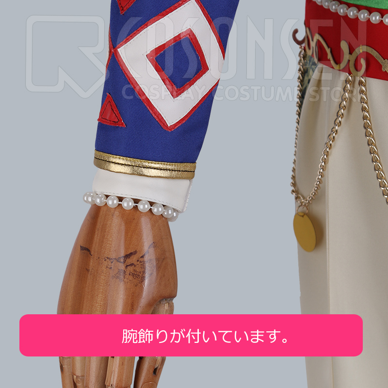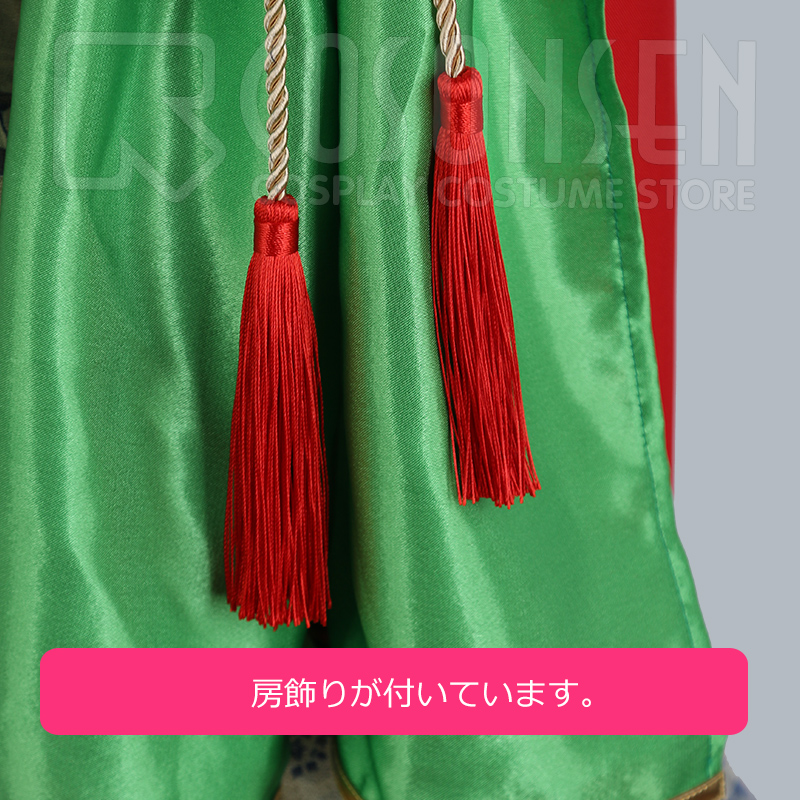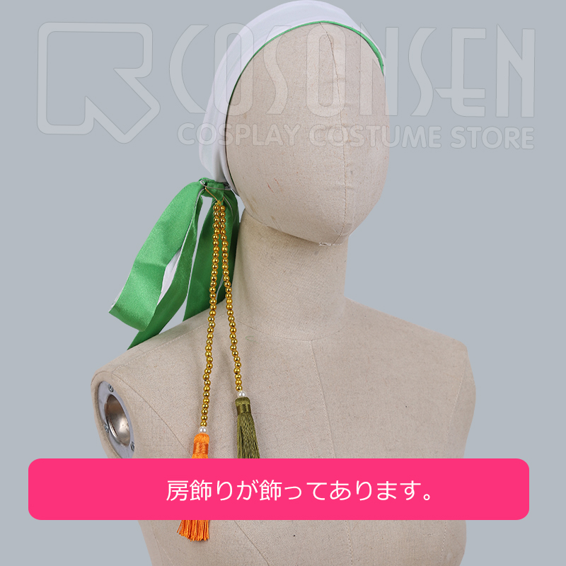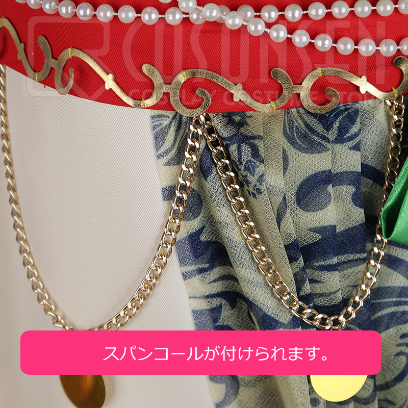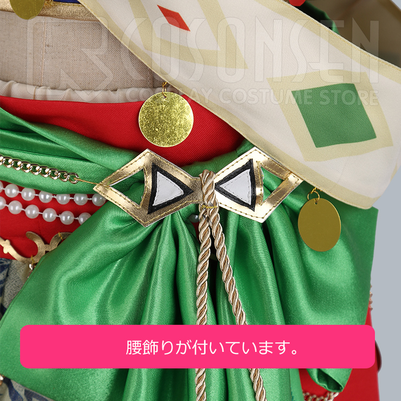 ヘアバンド、リボン、飾り、ネックレス2点、タスキ、腕飾り2点、腰飾り2点、腰帯、ボールチェーン、腰布2点も付属しています。