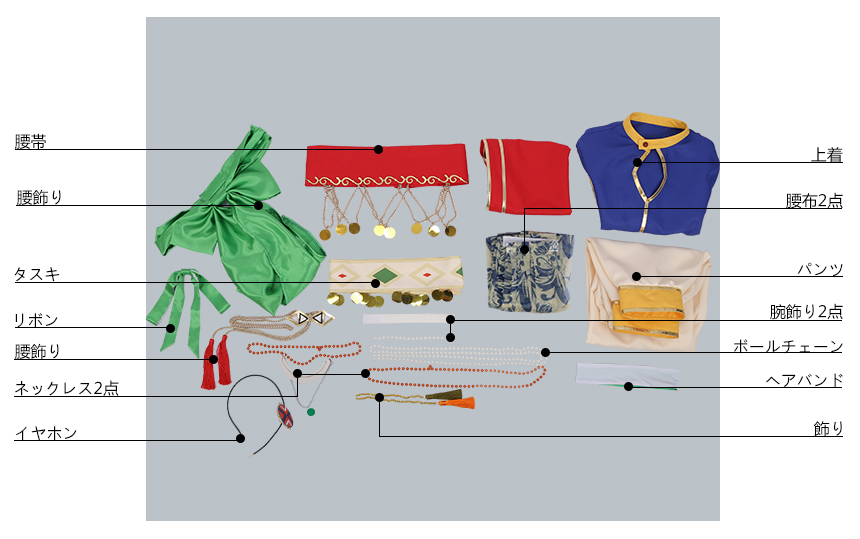 上着、パンツ、飾り物(ヘアバンド、リボン、飾り、ネックレス2点、タスキ、腕飾り2点、腰飾り2点、腰帯、ボールチェーン、腰布2点)