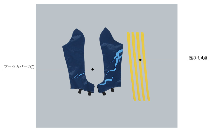鉢巻、ネクタイ、房飾り4点、首飾り、メダル、腰布、手袋2点、紐2点、腰紐も付属しています。
