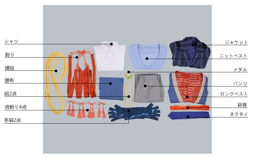 ジャケット、ロングベスト、ニットベスト、シャツ、パンツ、飾り物(鉢巻、ネクタイ、房飾り4点、首飾り、メダル、腰布、手袋2点、紐2点、腰紐)
