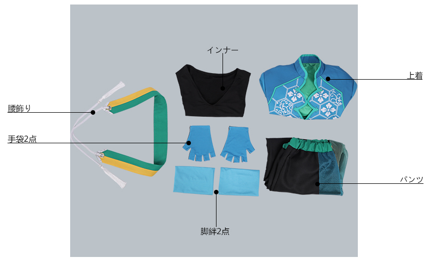 上着、インナー、パンツ、飾り物(腰飾り、手袋2点、脚絆2点)