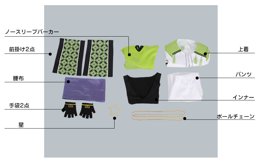 上着、ノースリーブパーカー、インナー、パンツ、飾り物(前掛け2点、腰布、ボールチェーン、星、手袋2点)